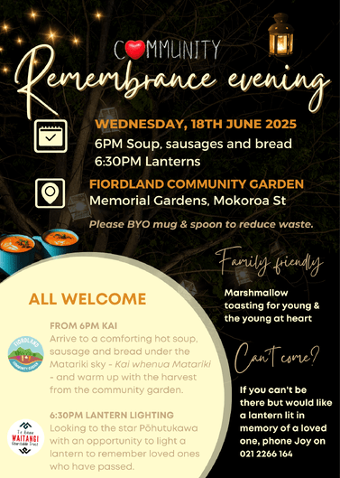 As the sun sets under the Matariki sky, join us for warm soup, sausages and bread share in this comforting kai whenua - harvest from the community garden - with fellow locals, family or friends.